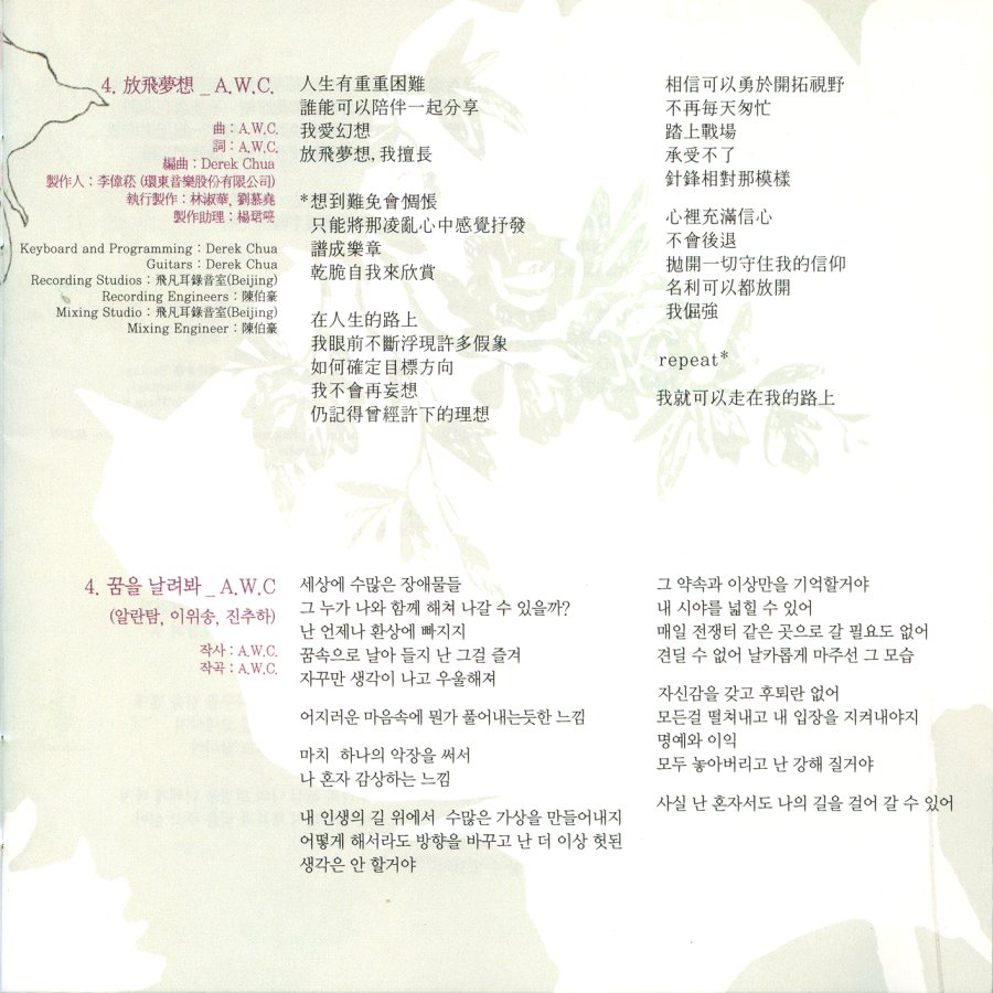 A4. 放飛夢想 3:41 曲: A.W.C. 詞: A.W.C. |