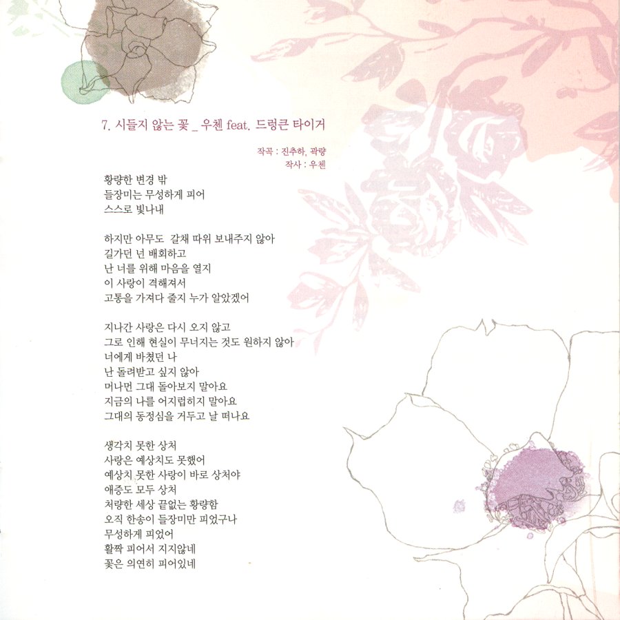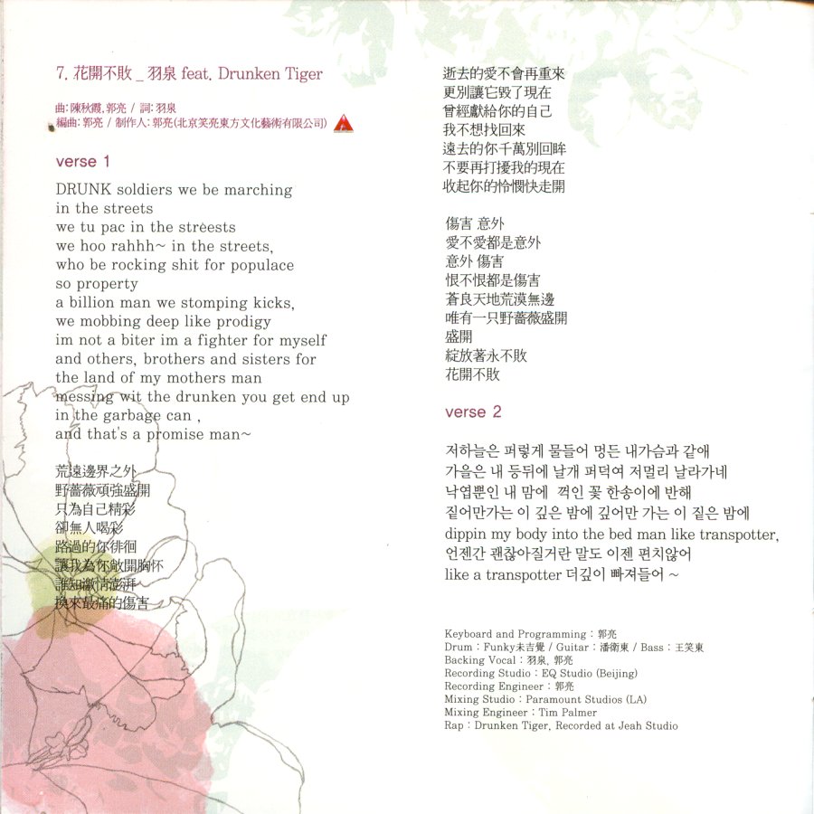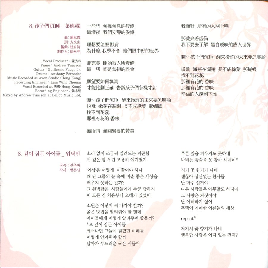 這深夜我們安靜的妥協 理想要怎麼默背 為甚麼我學不會 他們眼中好的世界 那完美開始被人所責備 這一切都是當初的誤會 願望要如何填寫 才能比劃正確 告訴孩子們怎樣才對 喔∼孩子們沉睡 醒來後許的未來要怎麼給 紛飛嫩芽在凋謝 長不成綠葉 那蝴蝶找不到花蕊 那裡有花的香味 無所謂 無關緊要的讚美 我面對所有的人閉上嘴 那愛夾著虛偽 我不要去瞭解 黑白曖昧的成人世界 嗯∼孩子們沉睡 醒來後許的未來要怎麼給 紛飛嫩芽在凋謝 長不成綠葉 那蝴蝶找不到花蕊 那裡有花的香味 喔∼孩子們沉睡 醒來後許的未來要怎麼給 紛飛嫩芽在凋謝 長不成綠葉 那蝴蝶找不到花蕊 那裡有花的香味 那裡有花的香味 幸福的人還剩下誰 |