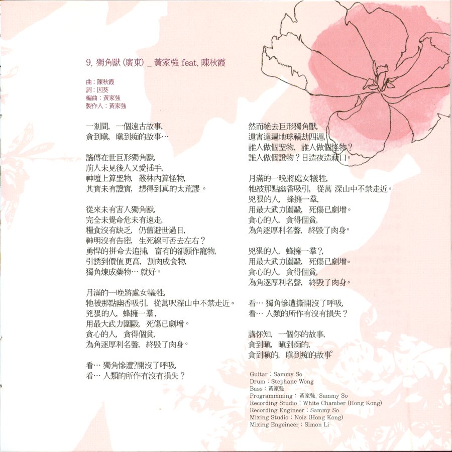 | (陳) 一剎間 一個遠古故事 貪到瞋 瞋到痴的故事 謠傳在世 巨形獨角獸 前人未見 後人又愛插手 神壇上算是聖物 叢林內算怪物 其實未有證賞 想得到真的太荒謬 從來未有害人獨角獸 完全未覺命危未有遠走 糧食沒有缺乏 仍舊避世過日 神明沒有告密 生死線可否去左右 勇悍的拼命去追捕 富有的卻願作寵物 引誘到價值更高 割肉成食物 獨角煉成藥物...就好 月滿的一晚將處女犧牲 牠 被那點幽香吸引 從萬呎深山中不禁走近 兇狠的人 蜂擁一群 用最大武力圍毆 死傷已劇增 貪心的人 貪得個貧 為角逐厚利名聲 終毀了肉身 看...獨角慘遭撕開沒了呼吸 看...人類的所作有沒有損失 然而絕去巨形獨角獸 遺害達遍地球禍劫四週 誰人做過聖物 誰人做過怪物 誰人做個證物 日造夜造藉口 月滿的一晚將處女犧性 牠 被那點幽香吸引 從萬深山中不禁走近 兇狠的人 蜂擁一群 用最大武力圍毆 死傷已劇增 貪心的人 貪得個貧 為角逐厚利名聲 終毀了肉身 兇狠的人 蜂擁一群 用最大武力圍毆 死傷已劇增 貪心的人 貪得個貧 為角逐厚利名聲 終毀了肉身 看...獨角慘遭撕開沒了呼吸 看...人類的所作有沒有損失 (陳) 講你知 一個你的故事 貪到瞋 瞋到痴的 貪到瞋的 瞋到痴的故事 |